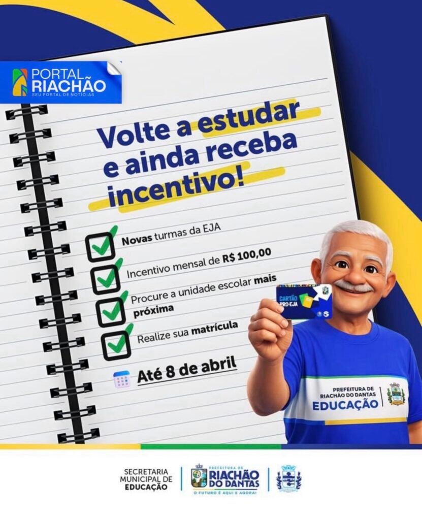 Voltar a estudar é recomeçar, é abrir portas e acreditar em novas oportunidades. Pensando nisso, a Prefeitura de Riachão do Dantas, por meio da Secretaria Municipal de Educação, está com novas turmas da Educação de Jovens e Adultos, a EJA, garantindo também um incentivo mensal de 100,00 reais para os alunos matriculados.